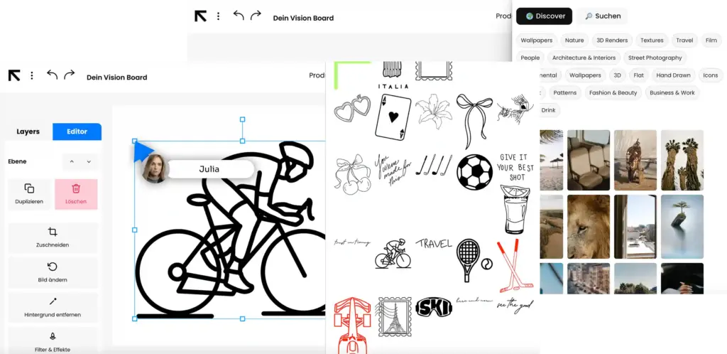 Starte ohne lange Suche: In unserer Galerie warten unzählige Bilder, Sticker und Symbole darauf, von dir genutzt zu werden. Ob minimalistisch, bunt oder verspielt – du entscheidest, was zu dir passt. So entsteht dein persönliches Vision Board Stück für Stück.