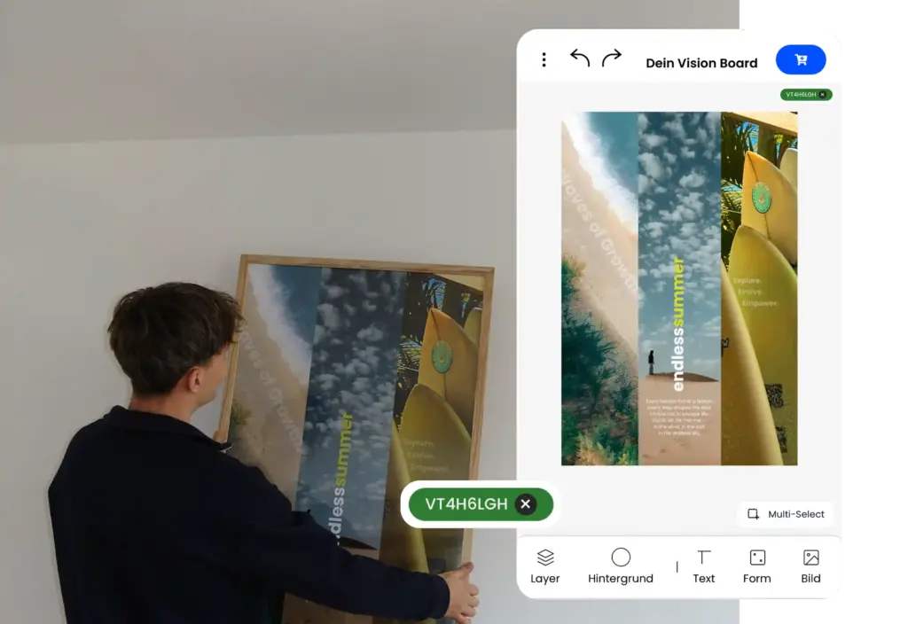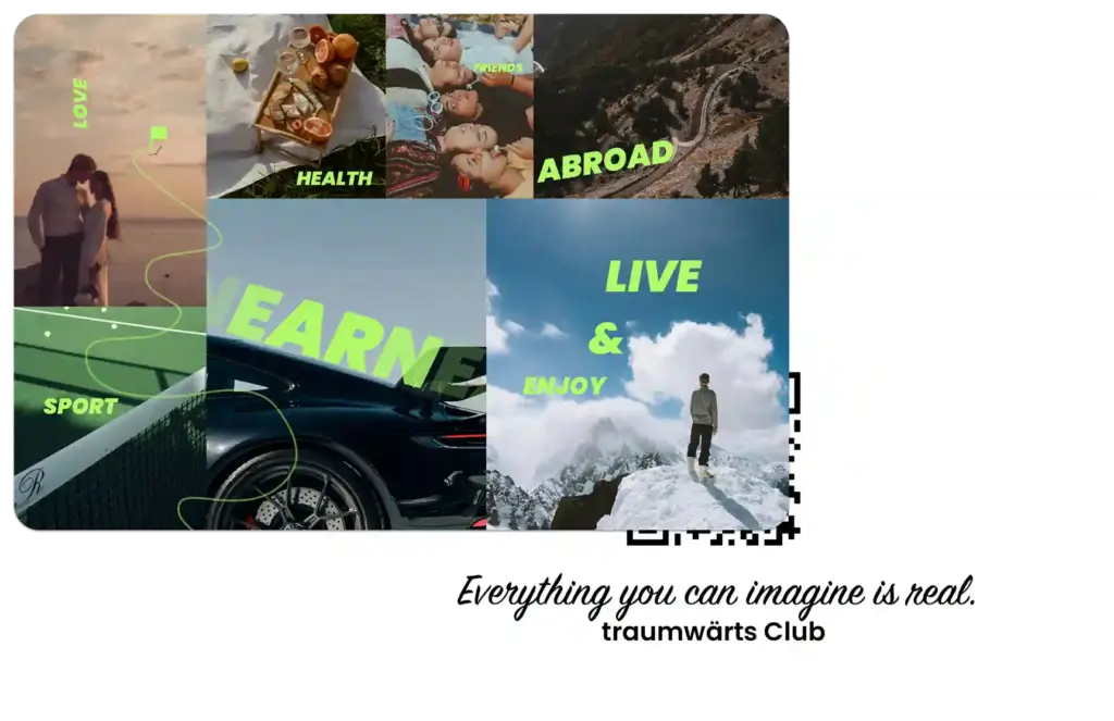Mit jeder Bestellung eines Posters oder einer Leinwand ab 40×60 cm erhältst du automatisch deine persönliche Traumwärts Club Card. Sie zeigt dein Vision Board zusammen mit einem QR-Code, über den du direkt wieder in deinen Editor gelangst – schnell, einfach und exklusiv. Dein Board immer nur einen Scan entfernt.